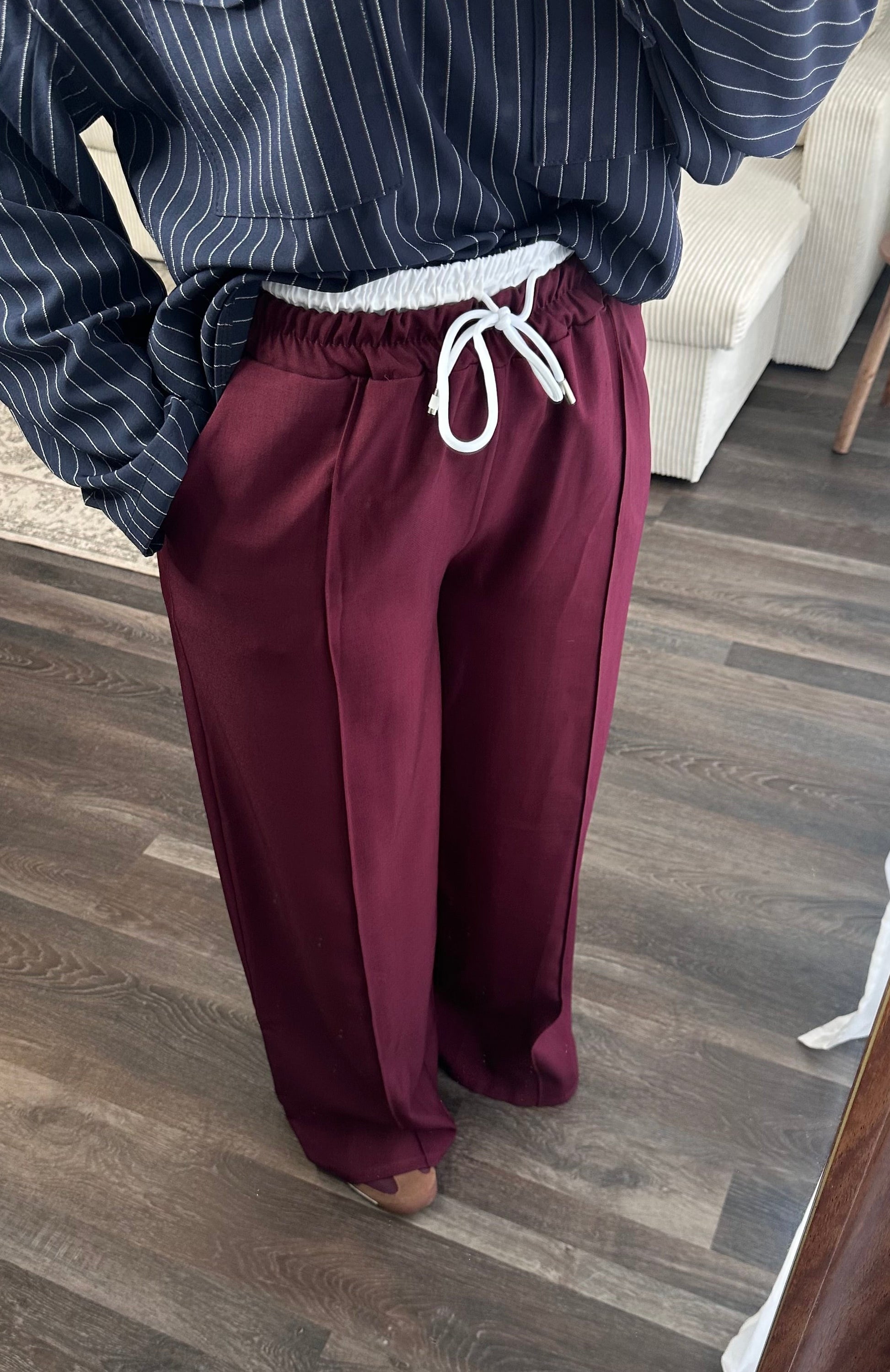 Pantalon ample bordeaux, détail blanc au niveau de la taille et entièrement élastique.